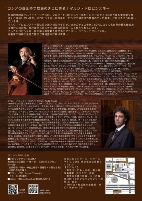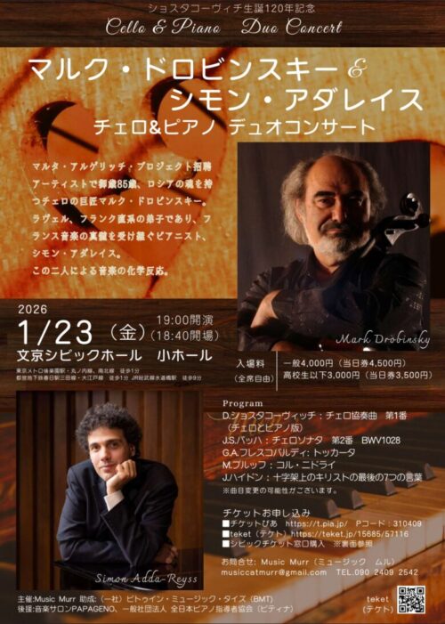2026年1月23日(金)に、チェリストのマルク・ドロビンスキーとピアニストのシモン・アダレイスによるリサイタルが東京で開催されます。